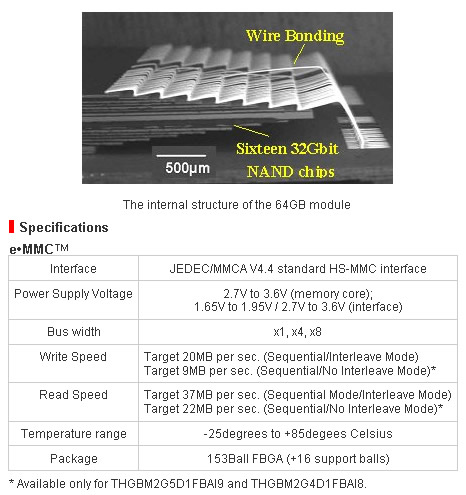The new 64GB embedded device combines sixteen 32Gbit (equal to 4GB) NAND chips fabricated with Toshiba's 32nm process technology, and also integrates a dedicated controller. Toshiba is the first company to succeed in combining sixteen 32Gbit NAND chips, and applied advanced chip thinning and layering technologies to realize individual chips that are only 30 micrometers thick. Full compliance with the JEDEC/MMCA Version 4.4(V4.4) standard for embedded MultiMediaCards supports standard interfacing and simplified embedding in products, reducing development burdens on product manufacturers.
