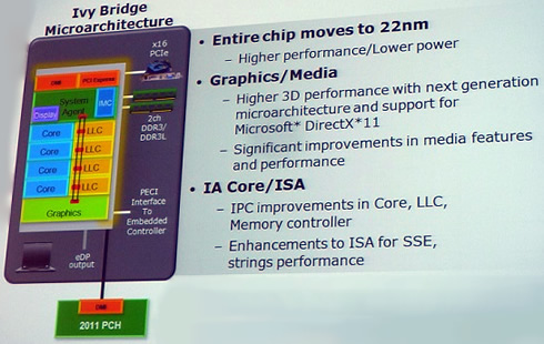 Intel gave its first public disclosure of Ivy Bridge at the Intel Developer Forum last month. Intel said that successor to the Sandy Bridge design boast significant improvements in on-board graphics, overall performance and a handful of advances in power management and security.