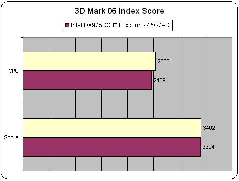 Below you can see all three available scores, memory, CPU and total. Looking at the CPU score, the Foxconn motherboard is faster, while Intel's 975XDX is faster in the memory tests. The overall score is in favor of the Foxconn motherboard.