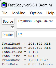 While with bigger files we do see a performance decrease, probably because the buffer of the drive fills up and we get around 1.02GB/sec writing speed.