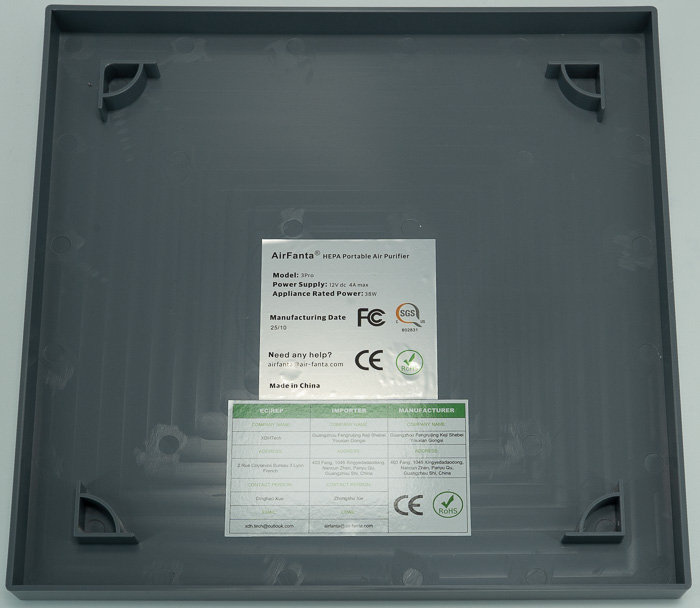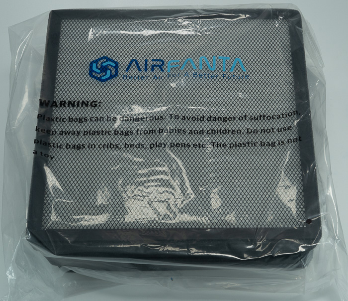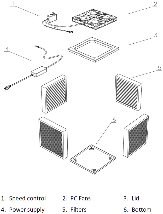 Opening the box, unveils its contents that are carefully designed for transportation hazards. Inside you will find a a plastic bottom plate, four filters H11 HEPA, and a pre-assembled fan+lid module.