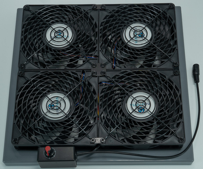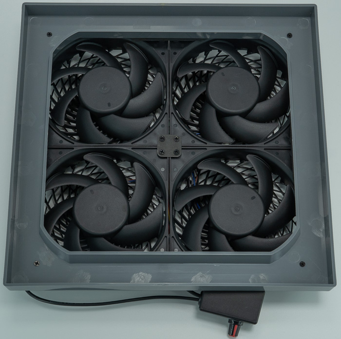 and the top plastic panel with pre-installed four 140mm fans. There is also a fan regulator for adjusting the stock fan speeds.