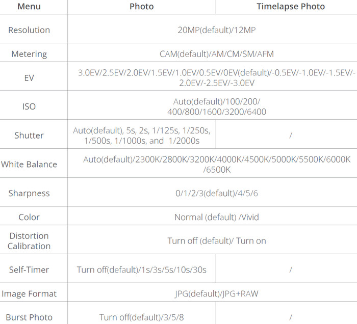 4K60/ 4K30 / 2.7K120 / 2.7K90 / 2.7K60 / 2.7K30 / 1440P180/ 1440P120 / 1440P60/ 1440P30/ 1080P120 /1080P60 /1080P30 |