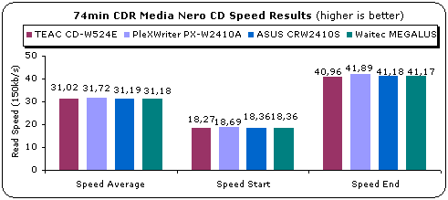 The ASUS and WAITEC MEGALUS drives improved their reading performance with CDR media. Both drives have 31.19X average reading speed, which is again faster than TEAC CD-W524E but slower than PleXWriter PX-W2410A.