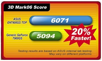The ASUS EN7900GS TOP graphics card features more advanced technology and superior performance. Equipped with the prominent GeForce™ 7900 GS GPU and fastest DDR3 memory, the ASUS EN7900GS TOP performs up to 20% faster than Generic GF7900GS series.
