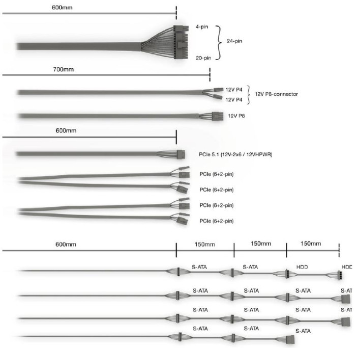 The PSU is designed with modular cables in mind and has two types: a sleeved cable (20+4pin) and the rest are flat. The maximum cable length is 105cm (SATA+PATA cables), while the 20+4 motherboard cable is 60cm, which should be enough even for big-sized cases. We would like to have a slightly longer distance between SATA and PATA cables of 200mm. Included, you will find 10 high-quality cables