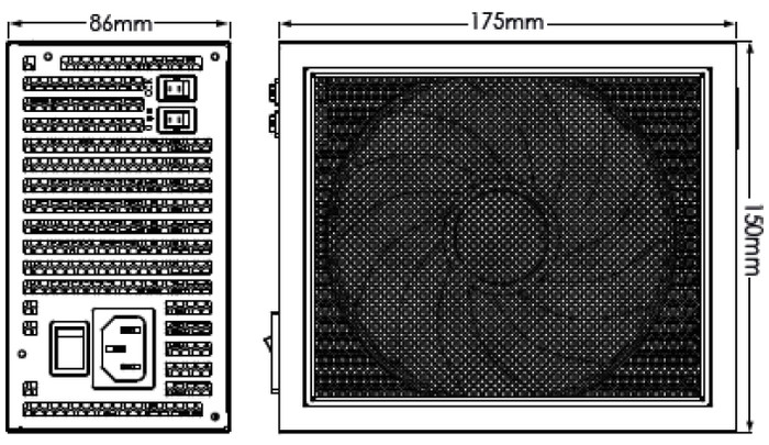 The PSU dimensions are (without cables) 175 x 150 x 86 (L x W x D), (mm), and its weight is 2.20 kg, making it heavier and bigger than other power supplies; however, it still fits in most midi/big cases.