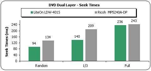 The seek times reported were higher than those with the single layer DVD-ROM. However, this is normal and was noticed with all the DVD readers. LiteOn LDW-401S needed 94msec for the random seek and 236msec for full seeking: