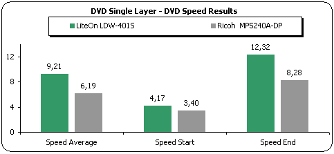 The differences between the drives was expected, since the LiteOn offers 12x CAV reading while the Ricoh drive is slower with 8x CAV. The LiteOn drive read the single layer DVD-ROM fast and the reported average speed was 9.21x. The end speed for the drive reached the 12.32x.