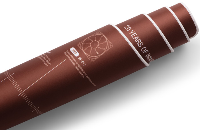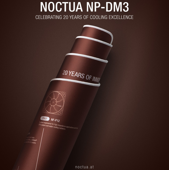 Noctua, apart from the well-known CPU coolers and thermal paste, enters a different arena to "compete" with other manufacturers, but with their own and unique way to present products. The new NP-DM3 desk mat is a 90cm mat that covers your desk and commemorates key milestones in Noctua’s history, from the first NH-U heatsinks and NF-S12 fans to landmark products like the NF-P12 or NH-D14, all the way to the latest G2 models.