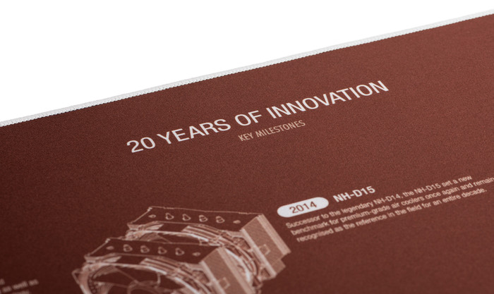 The NP-DM3 depicts key milestones during Noctua’s history of innovation: Starting with the original NH-U12 heatsink and the first-gen NF-S12 fan, it spans a timeline from 2005 over later legends like the NF-P12 and NH-D14 and all the way to today’s G2 models.