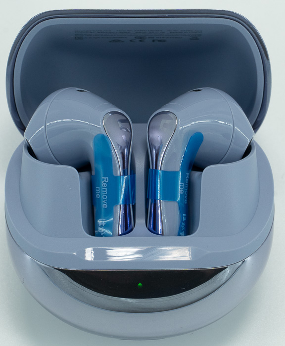 Each earbud has 35mAh and the charging case has 400mAh capacity. The charging time is around 120mins for a full charge (inside the charging case), while the charging case alone can be charged at 90mins. The product with the charging case should last around 24 hours of continuous playtime according to the official specs. The case has a spring-loaded clamshell design that snaps firmly closed and both earbuds are attached magnetically when you insert them for charging. On the front of the case, there is a button for displaying the battery level via a colored LED: green (70%+), yellow (20%+), or red (<20%). When charging, the LED gets adjusted to green (50%+), yellow (10%+), or red (<10%).