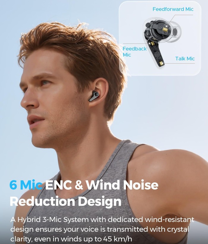 6-mic array with AI ENC; wind-resistant to 45 km/h |