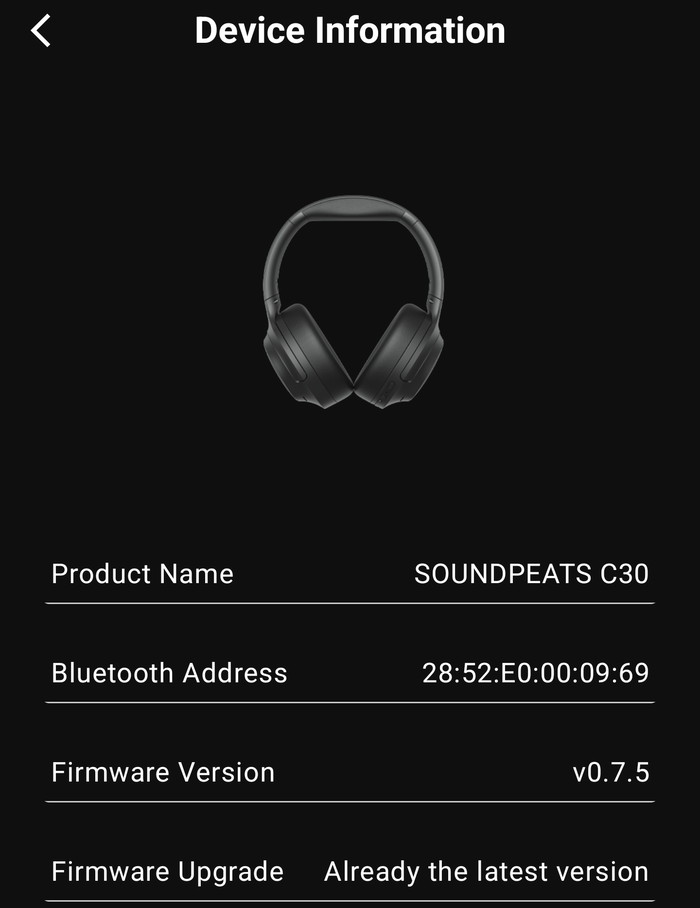 The app requires an email address for account creation, there is no option to skip or use anonymously, data privacy policy standard but not particularly reassuring and the account is being used across all SoundPeats products. Users have to enable BT to find the device, make the pair and open the PeatsAudio app. At the main screen you will find the newly added device (C30).
