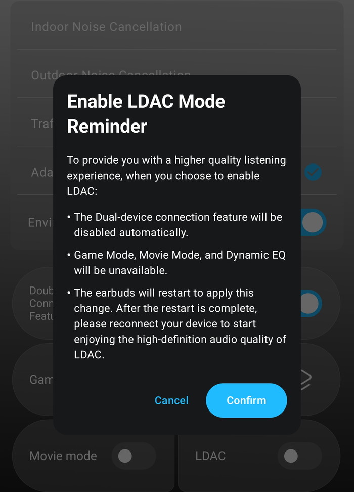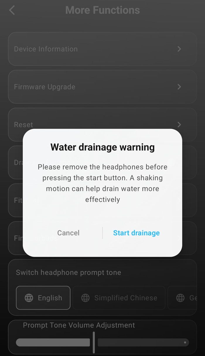 The control set includes: three ANC modes with four intensity levels; adaptive EQ via a personal hearing test; 12 named EQ presets (Classic, Bass Boost, Bass Reduction, Treble Enhancement, Electronic, Popular, Classical Music, Rock & Roll, Folk, Book Whisper, plus two more); full custom EQ creation; per-earbud touch control remapping for single tap, double tap, triple tap, and long press; dual-device connection toggle; low-latency gaming mode and movie mode; fit test; find-earbuds function; firmware OTA updates; voice prompt language and volume; LDAC/AAC codec selection (Android only); and a water drainage mode that uses sound waves to expel moisture from the earbud nozzles — a feature more commonly seen on smartwatches. The ability to disable all touch controls entirely is a practical bonus for sleeping and showering use.