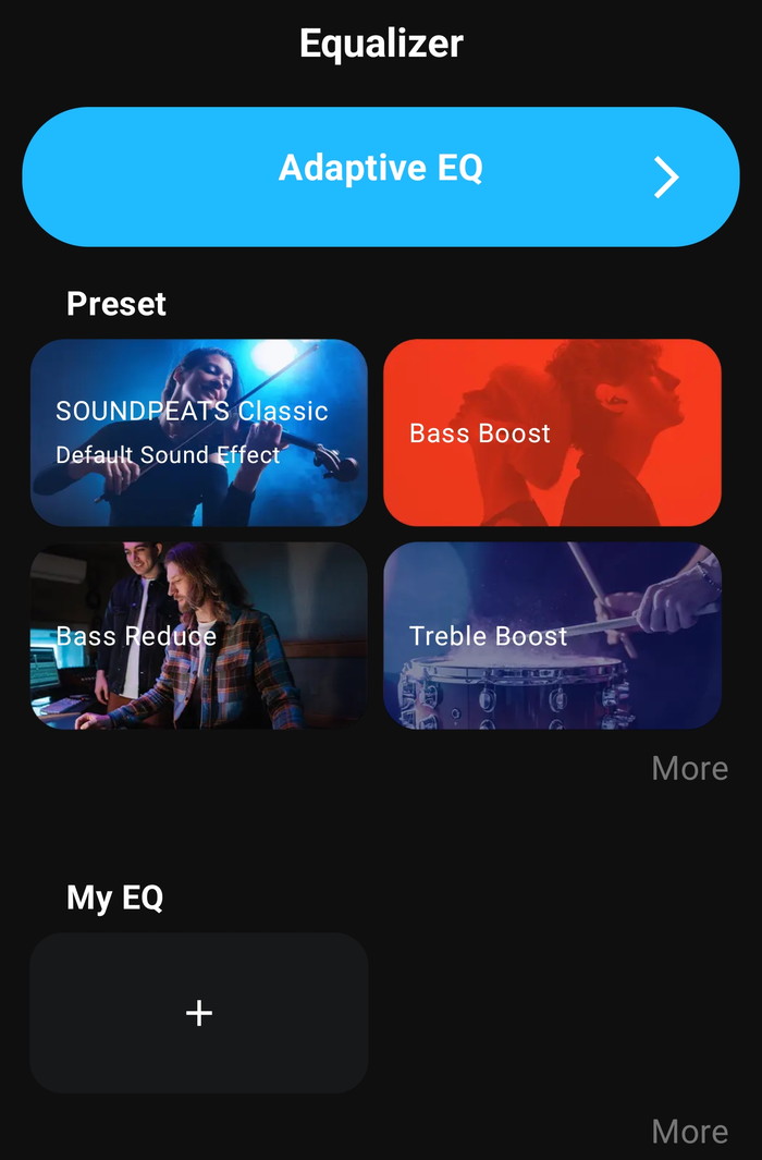 The adaptive EQ is the standout feature. The hearing test presents tones at specific frequencies and adapts the EQ curve to the user's individual hearing profile. The effect is audibly significant — more so than most preset EQ options — and is the fastest route to a genuinely personalized sound without manual tuning. This feature alone justifies installing the app even for users who would otherwise skip it.