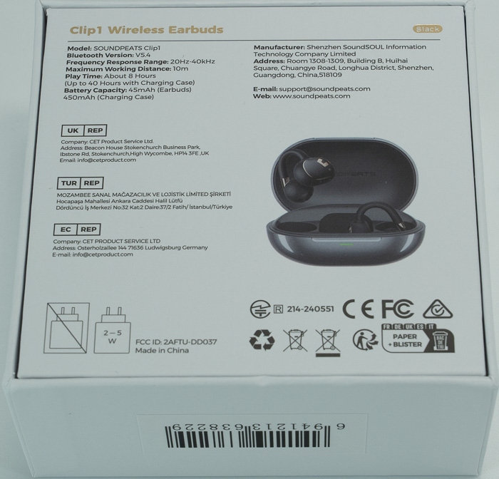Each earbud has a 45mAh battery, and the charging case packs a 450mAh battery capacity as well. The charging time is around 1h for a full charge for the earbuds, while the charging case alone can be charged in 2.0h. There is also fast charging supported, meaning with 10minutes, users can gain up to 2 hours of playback. The built-in battery of the carrying case can be used to recharge the Clip1 product up to 4 times, increasing the total working time up to 40hours. The product with the charging case is rated for 8Hrs Playtime + 40Hrs with Charging Case (60% Volume (AAC codec, standard mode). Increasing volume or changing codec mode may decrease overall playtime.