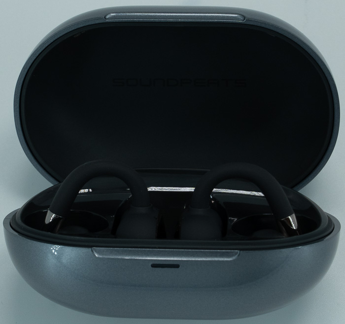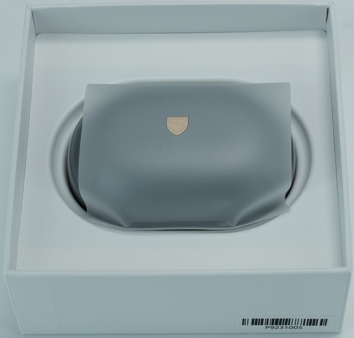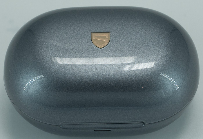 The main carrying case is protected via a plastic sheet and is made out of shiny plastic with the SOUNDPEATS logo in front and a slide-up mechanism to protect/charge the main product.