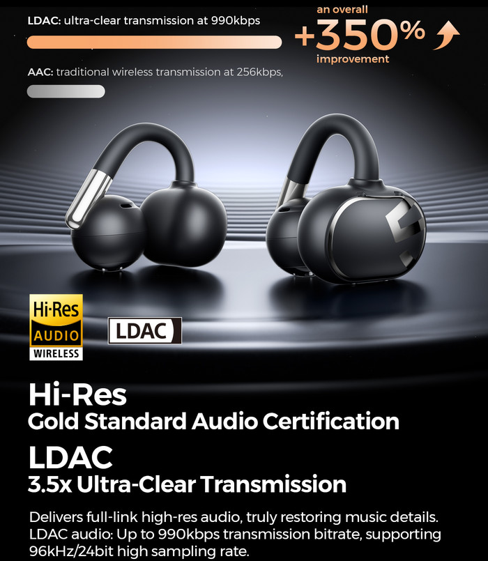 Hi-Res audio captures the original analog audio source with virtually no loss, faithfully reproducing sounds in detail. Unlike CDs, which discard some audio during recording, high-resolution audio includes much more information, such as "thickness, delicacy, depth, and sound pressure level," containing about 6.5 times more data than a CD. As a result, the audio quality is much closer to the original recording, allowing listeners to experience nuances and atmospheres previously inaudible on CDs. LDAC boasts high-resolution audio transmission, supporting up to 24-bit/96 kHz sound with a maximum bitrate of 990 kbps, nearly three times higher than SBC (328kbps, 44.1kHz), which helps you enjoy a dynamic music range, making it particularly suitable for handling high-resolution audio files. Note: The phone must be Android 8.0 or above and must support LDAC itself.