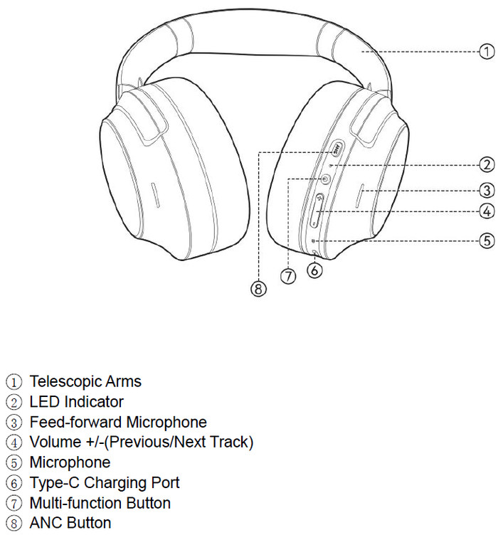 Users can power on the device by press and hold Multi-function button for 2 seconds (white light solid for 1 second) and Press and hold Multi-function button for 3 seconds (red light flashes for 2 seconds) to Power Off. When you start using the device for the first time the device enters pairing mode (red and white alternating) and if you Press and hold Multi-function button for 4 seconds while powered off, you enter again in the Pairing mode. The ANC Toggle cycles Transparency → ANC Off → ANC On. For the Volume/Track control, single tap Volume +/- for volume adjustment, Hold Volume + for 1.5s: Next track, Hold Volume - for 1.5s: Previous track. To Play/Pause, single tap Multi-function button and you can enter the Gaming Mode Toggle by Triple-tap Multi-function button to enable/disable 60ms low-latency mode. When are in call mode, a single tap at the Multi-Function button answer/end calls and by holding 1.5 second the Multi-Function button, you access additional functions via app configuration.