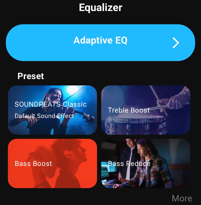 The App provides control over sound signature with 9 EQ Presets available, while Adaptive EQ is also possible: