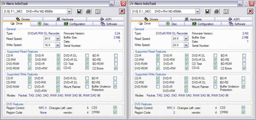 Hello! First, exuse my bad enlish,,, Second, excuse me for beeing the one ho dont understad all that is written here.. My problem. Got the ND-6500A, put in my laptop, Toshiba Satellite Pro 6000, did not find the NEC... Solder between 45 and 47, FINE, the computer finds the NEC burner, Nero says no Image Recorder? DVD Decrypter cant lock the unit, so it stops and refuse to burn DVD. What to do? Tried to look for the 6500Boot.zip file but did not find it enywere Nero infotool says that the driver is L: but in exlorer it is D:... dont understand this.... Nero says Firmware 2.22. And it is a master on the second IDE channel, with DMA off. My HD is on the Primary Channel with DMA on Looked at page 1 and dont find were to download enything??? Can someone pleasse mail me the file? More Q: What is the difference betwene 2.xx and 4.xx firmware? Is it good to have DMA on for the NEC? if so How do I do it? Thank you / Stedal