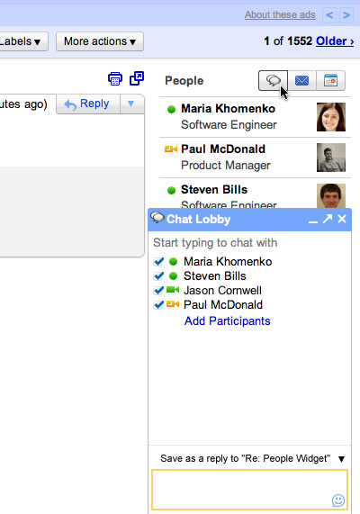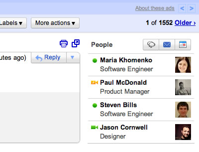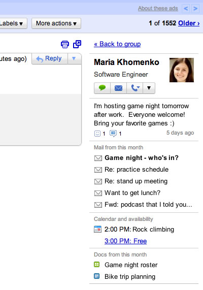 Next to every email message, Gmail users will be able to see contextual information about the people in that conversation including recent emails they received from them, relevant Buzz posts, shared documents and calendar events. Users will also have quick access to a variety of ways to communicate with individuals, start a group chat or schedule a meeting with groups of people.