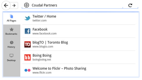 The Awesomebar uses the same tabbed menu to allow quick access to bookmarks, history, and your synced desktop activity. Users of the current phone version of Firefox will notice that the tabs have been moved off to the left, which increases the number of results that can be displayed above the keyboard.