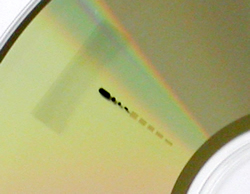 The test concept with Philips SBC 44A is the same as in the previous test disc. Interruptions on the information layer vary from 400 micrometers to 1000 micrometers, while black dots have size of 300 micrometers to 800 micrometers. Once again the DVR-720H-S read the contents of the disc without any problems.