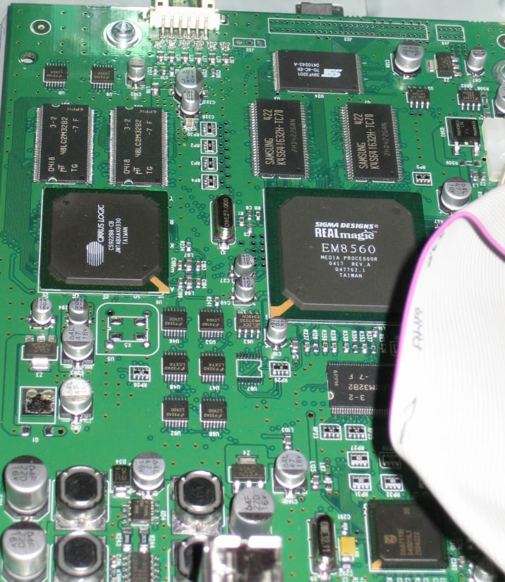 MPEG-4, MPEG-2 and DVD decoding. Incorporating flexible, advanced audio/video processing, the EM8510 family enables cost-effective solutions for consumer products, such as portable media players, digital media adapters, and networked DVD players. Unique features offered by the EM8510 family include analog YPbPr/RGB video outputs with optional scaling up to HDTV resolution and support for external MPEG encoder and networking chips. A wide variety of media types are supported, accessible through a powerful navigation engine..."