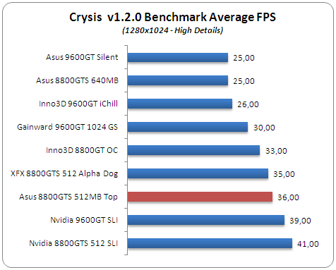 Crysis is probably the defacto benchmark game since almost no currently sold card can offer acceptable frame rates, especially under high quality settings . All tested graphics cards offer acceptable frame rates at 1280x1024 and high quality settings set. The Asus EN8800GTS 512 Top is just one FPS faster than the XFX 8800GTS Alpha Dog, at least looking at the overall average rates. The 8800GTS 512 SLI combo gives you additional 5 FPS.