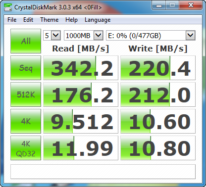 The benchmark confirmed previous performance figures at least in the sequential read and write tests - 342MB/s and 220.4 MB/s for read/write, respectively. However, it was extremely slow when it was randomly dealing with smaller files.