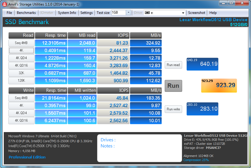 The drive itself is compact in size, easy to carry around and easy to use offering plug-n-play convenience. Our benchmarks showed that it is adequately fast in the sequential read and write tasks, reaching the 340MB/s and 200 MB/s for read / write, respectively. That's probably faster than your CF card but not exactly what Lexar is promising and what we would expect from an external SSD.
