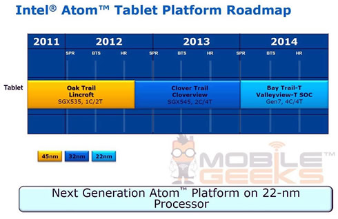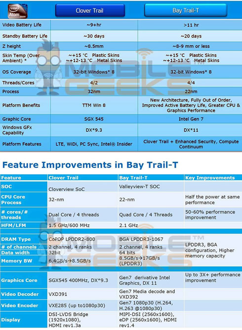 German tech blog Mobilegeeks.de published Intel's roadmap online, which shows the current Clover Trail systems being replaced with the 7th generation Atom dubbed Bay Trail-T line. According to the leaked slides, the new chips will run at up to 2.1Ghz, compared to Clover Trail's 1.5Ghz, giving a 50-60 % boost to computing performance although is does not support hyperthreading.