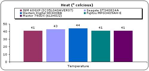 As we can see, the Western Digital WD400BB drive had the highest temperature among the four tested drives. Of course the difference with the rest drives is not that high but the IBM/Maxtor and Fujitsu drives seem to have slight better behaviour.