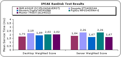 At the above picture, the weighted (Average) score of all tested drive is shown up. The drive with the best behaviour under for the Intel's IPEAK "Desktop" test comes from IBM. The drives weighted score is 1.73. The Western Digital comes second at the "Desktop" but first at the "Server" test. The Maxtor 740DX comes also first at the "Server" test, with 1.67ms, and gets one of the last places at the "Desktop" with 2.02ms. The FujiTsu comes forth at the Desktop and last at the Server test. The Seagate Barracuda ATA III has the worst values in both Server/Desktop tests.