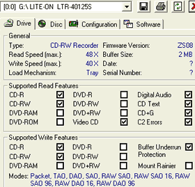 The drive was a February 2002 model with firmware revision vZS08 installed. We used the latest Nero build (5.5.7.8), InCD (3.24) and CloneCD (3.3.4.1) for our recording tests.