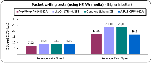 LiteOn LTR-40125S has a highest writing performance under packet writing format with 8.69X. Cendyne Lighting III follows with 8.66X and ASUS CRW4012A third with 8.65X. PleXWriter PX-W4012A stays below since it didn't manage to reach the 12x re-writing speed with the test disc. In the reading part, LiteOn LTR-40125S comes first with very fast reading speed of 23.18X.