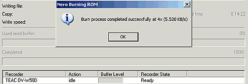 The following pictures come from Nero, after successful burnings with both drives. The amount of data is the same for all the tests.