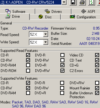 The AOpen CRW5224 supports CAV recording technology for reading/re-writing and recording. The drive's features as Nero Info Tool reports are: