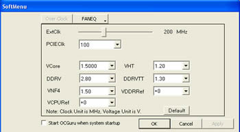 The program suite is composed of five different applets: ABIT EQ, OC Guru, FlashMenu, BlackBox, and GuruClock. ABIT EQ monitors all the BIOS monitored fans, the system voltages and temperatures. The OC Guru applet allows the real time tweaking of all board FSB and voltage settings. There are many preset options and the ability for automatic overclocking configuration. By selecting the Power Cycle control button we are able to make a timed shutdown to the system or view real time statistics on the systems boot time. From the Soft menu we can reconfigure all boards FSB and voltage options. Using the Configure AutoDrive button, we can tie individual programs to a preset overclocking configuration.. |