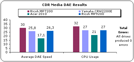As the tests showed, the Acer 2010 denied reading our test disc and returned a reading error code. The rest of the drives have no problems reading the dirty disc, even if they produce some errors. Both Ricoh MP7200/9200 drives return almost 70% of the reading data as inaccurate. The Yamaha 2200E seems a quite good performer, since the reading errors are only 0.14% of the total disc capacity.