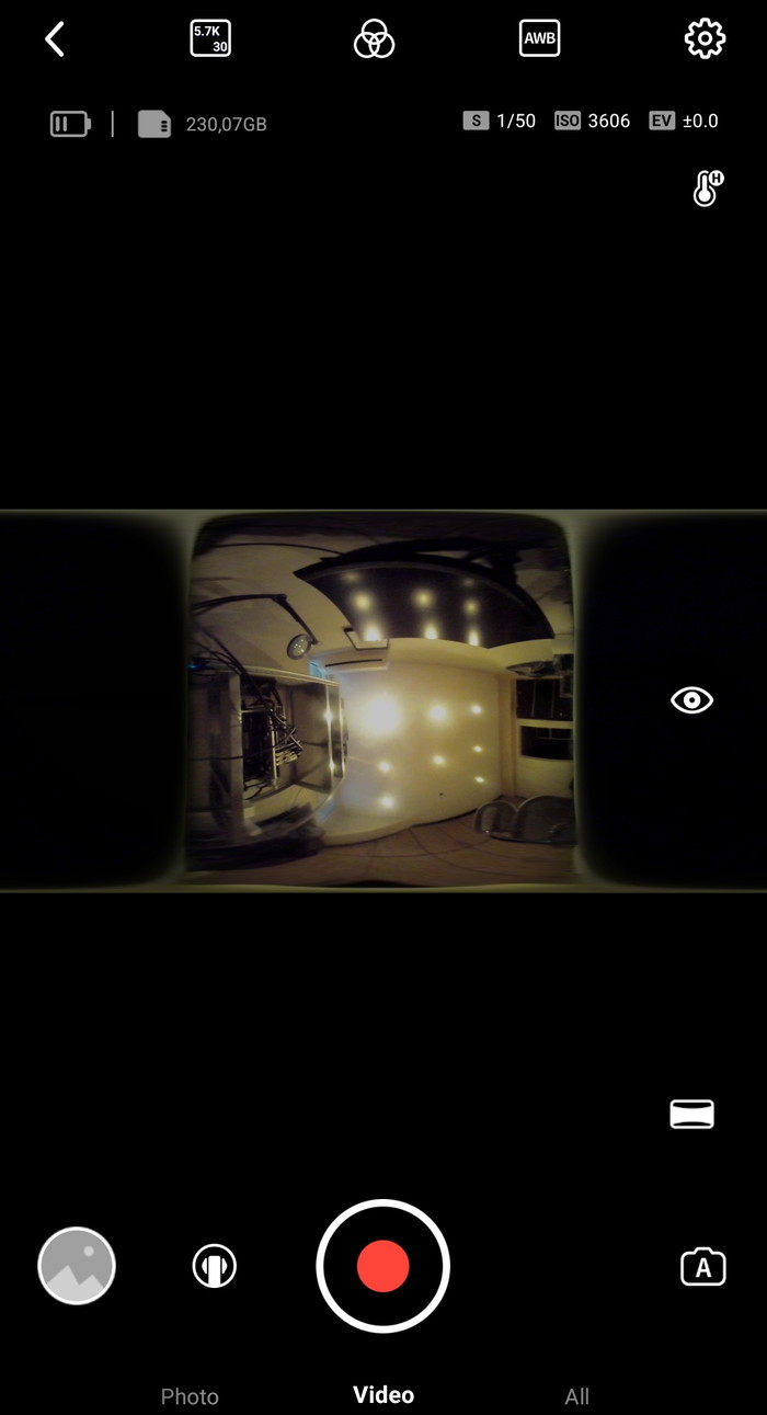 At the main screen of the Akaso 360 App in the top area, you will get a quick settings area, while at the bottom the working mode (Video/Photo)