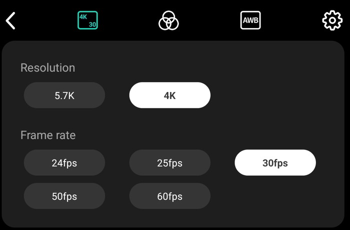 At the top, you can set Video Resolution and Frame rate, either for 5.7K or 4K.