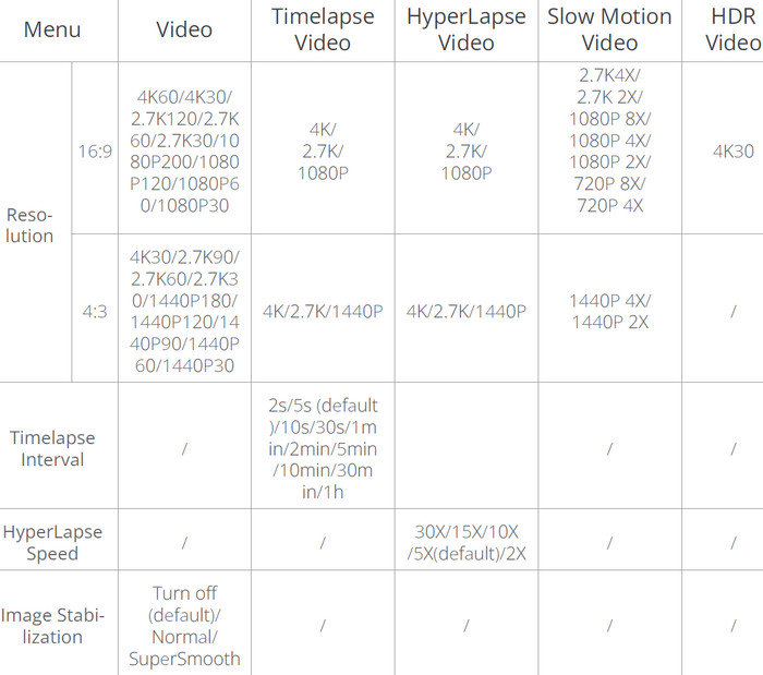 4K60/ 4K30 / 2.7K120 / 2.7K90 / 2.7K60 / 2.7K30 / 1440P180/ 1440P120 / 1440P60/ 1440P30/ 1080P120 /1080P60 /1080P30 |