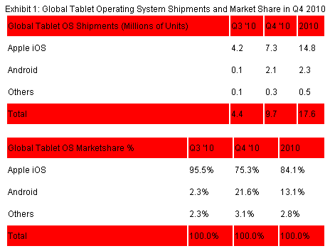 Android Captures 22 Percent Share of Global Tablet Shipments in Q4 2010