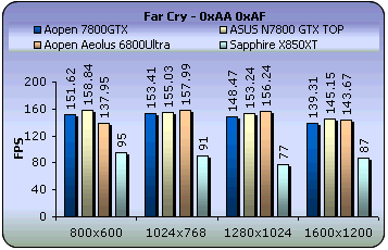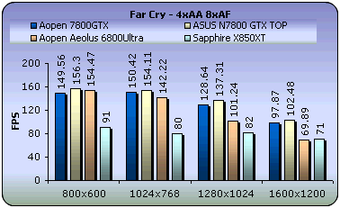 With AA and AF enabled, the AOpen card was slightly behind the N7800 ASUS card. In comparison to the 6800 and ATI cards, the difference in fps is considerable, especially at 1280x1024 and above.