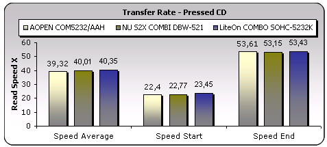 The AOpen drive managed to return quite acceptable reading speeds, as indeed did all the drives as seen from the screenshots. The drive used CAV reading strategy and CDSpeed reported an end speed of 53.61X. The test finished, reporting the access times for a pressed CD-ROM and the results are summarized on the seek times graph. Although there is not much between the three drives, in general the AOpen drive was slightly slower and had higher seek times.