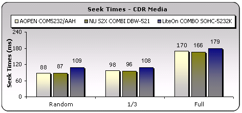NeroCDSpeed reported a very slow start reading speed for CD-R media. The test started at only 6.15X but the speed increased to 24X after only few sectors and under CAV the test finished with an average speed of 38.96X. The transfer rate graph shows that the AOpen drive gave back slightly slowest reading speed among the three devices but the end reading speed meets the manufacturers specifications and so can be considered as accepted. The seek times of AOpen, with CD-R media, were about equal to the other devices but as the seek times graph shows, AOpen proved faster than LiteOn in all three modes.