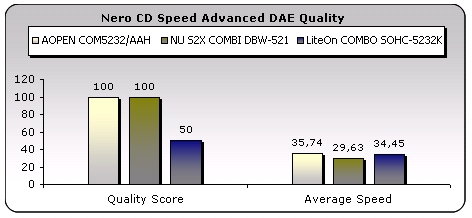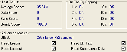 The above graph shows that the LiteOn was the only device that wasn't awarded a quality score of 100 (perfect). The AOpen had the fastest average speed at 35.74X while as the screenshot from Advanced Dae Quality shows, the drive is able to read Leadin/Leadout, CDText information and Subchannel Data.